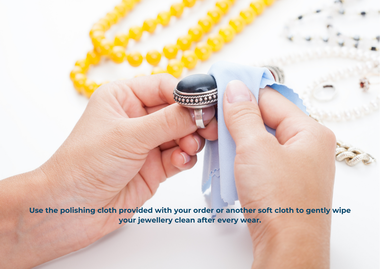 You will be provided with a small polishing cloth with your order. Use this to regularly wipe clean after use. You can also use professional silver polish and/ or a soft microfibre cloth to gently wipe clean. Be careful of some clothes that can scratch your jewellery if they are not soft enough.