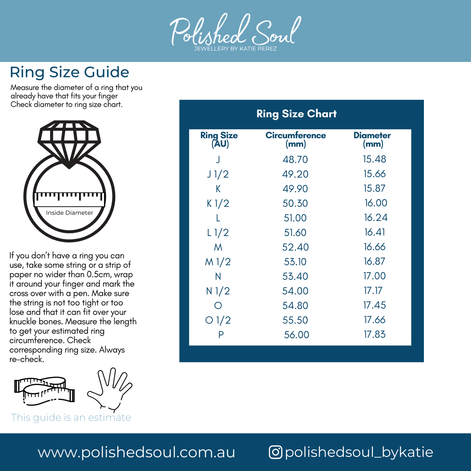 Use the guidelines above and this ring size chart to estimate your ring size. Please note this is a guide only.