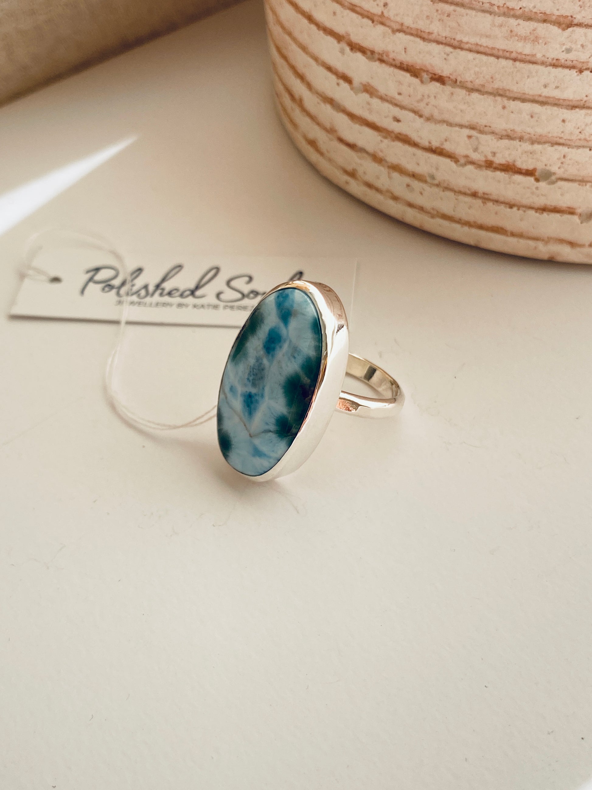 The Soul Tide ring features a striking Larimar stone in shades of blue and green, reminiscent of the sea’s shifting colours. Known as the stone of serenity, Larimar is thought to soothe the soul, ease stress, and bring a sense of calm clarity.