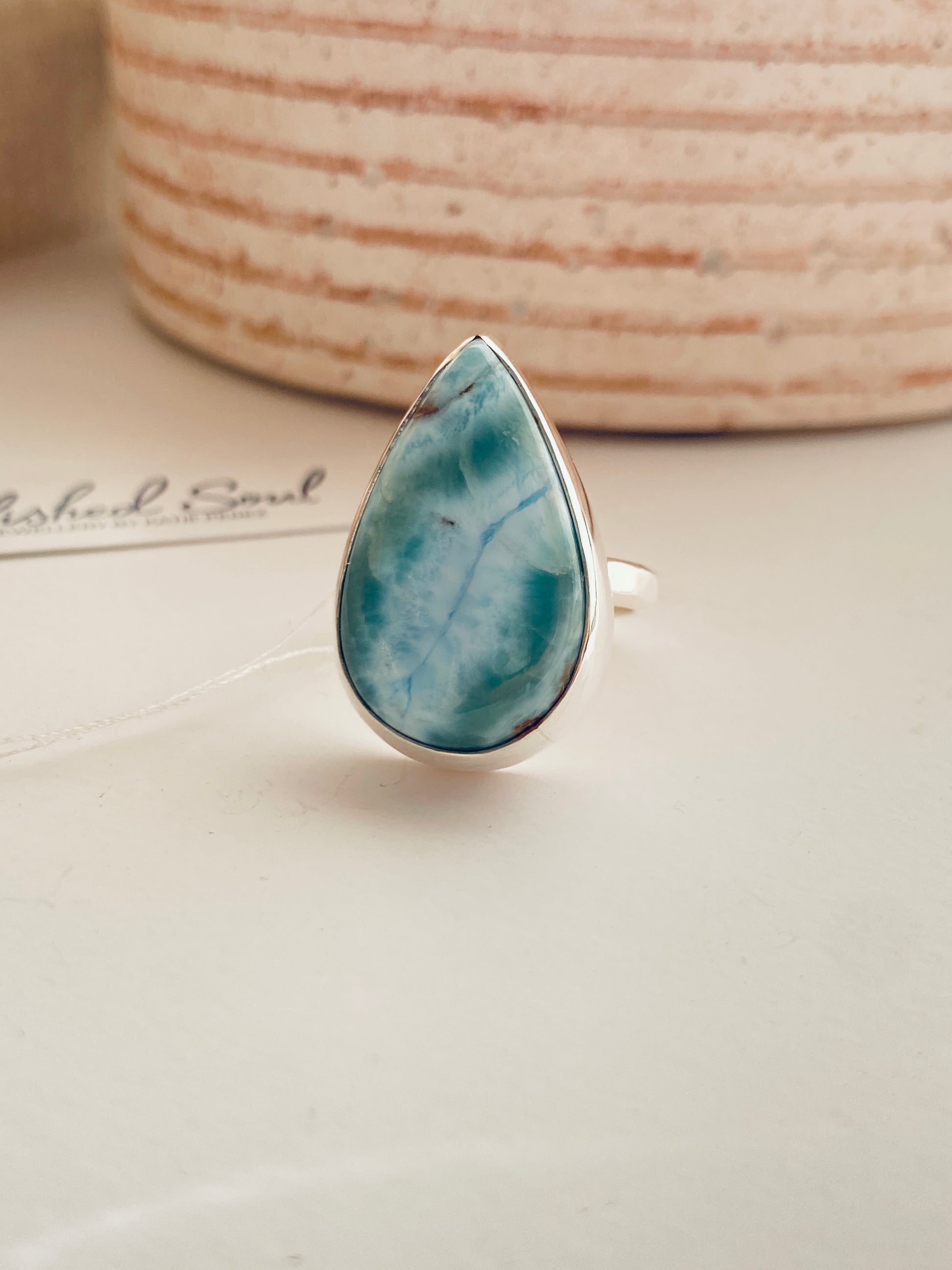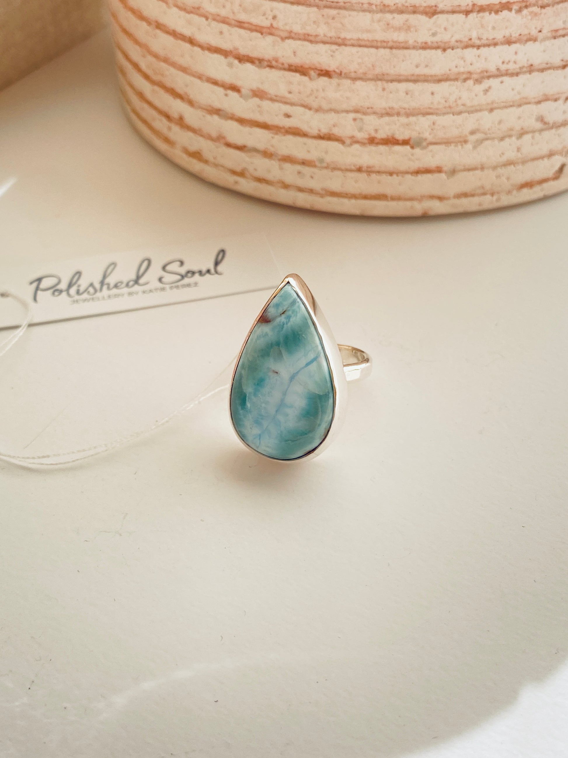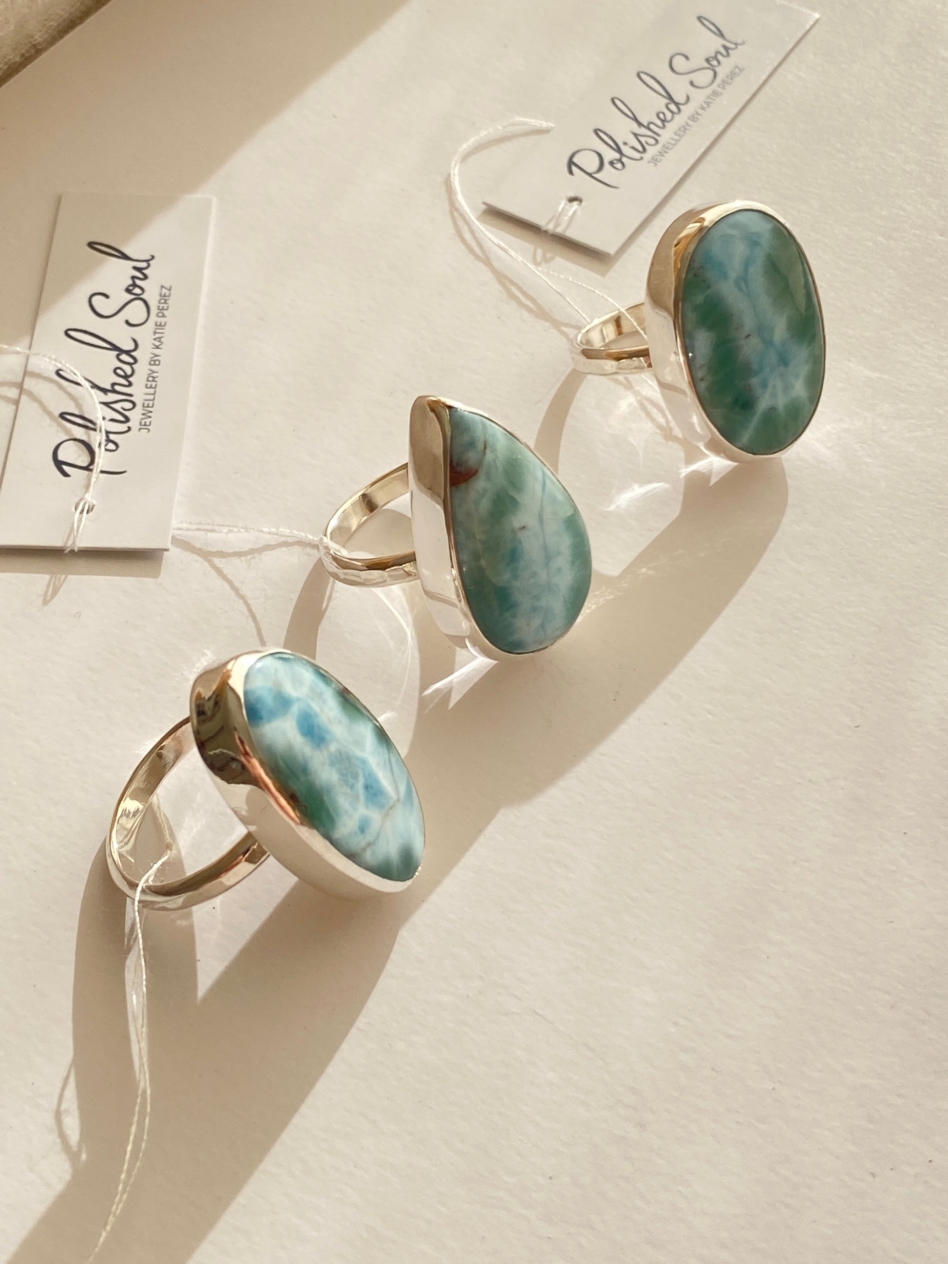The Soul Tide ring features a striking Larimar stone in shades of blue and green, reminiscent of the sea’s shifting colours. Known as the stone of serenity, Larimar is thought to soothe the soul, ease stress, and bring a sense of calm clarity.
